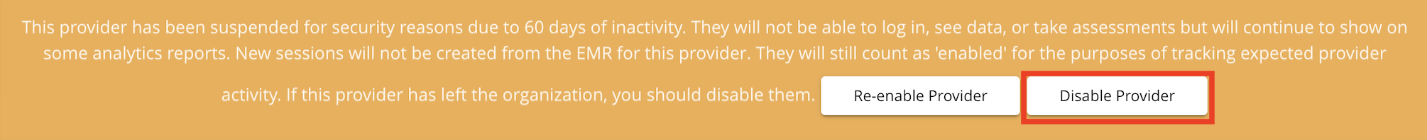 There will be a message saying that the user has been disabled due to inactivity, usually after 60 days of not signing in. Note users in these status are Provisioned but not Active. To make them no longer Provisioned, click Disable Provider. To make the user active again, click Re-enable Provider.