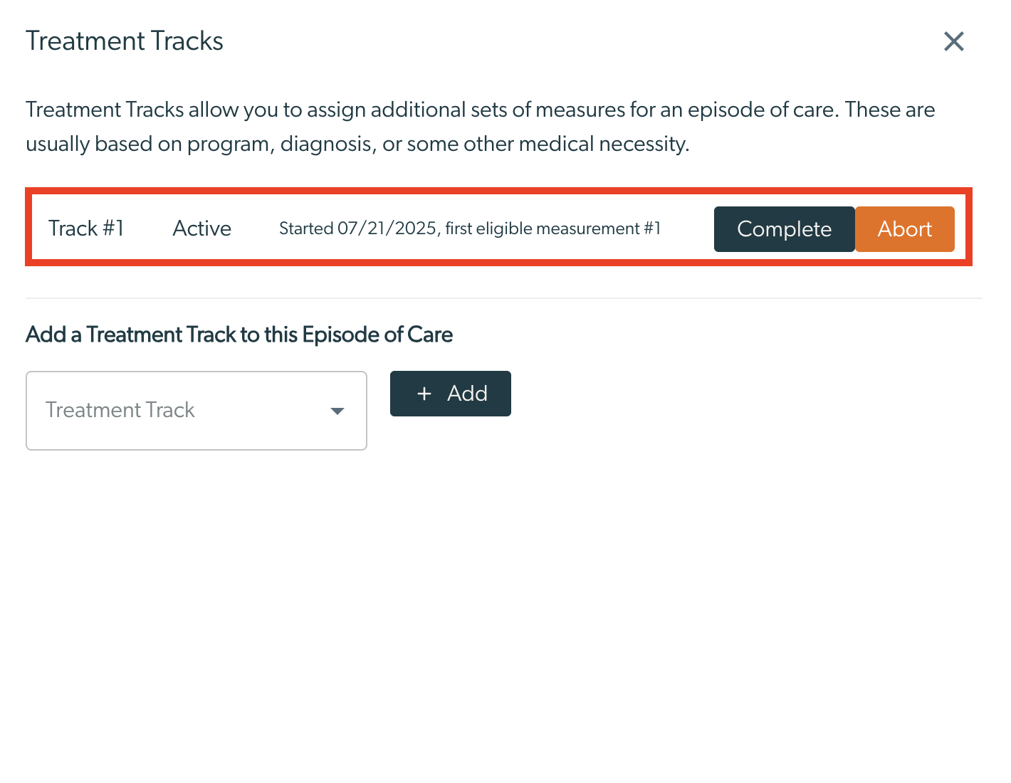 - The “Abort” button allows for the removal of a treatment track from the episode of care, if it was added in error.