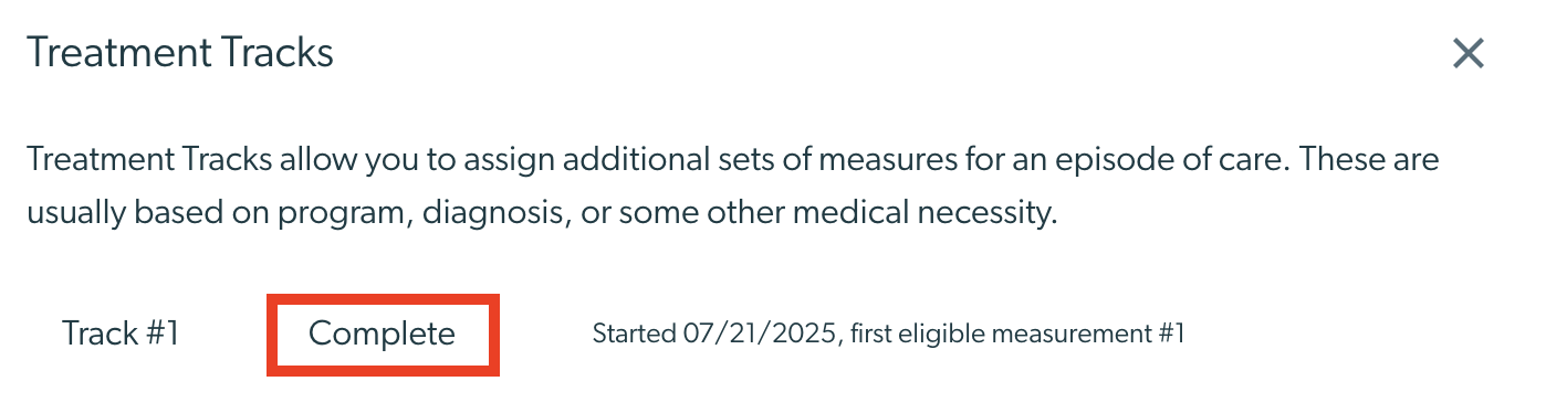 - The "Complete" button allows a user to mark the treatment track as complete for the episode of care. Marking a treatment track as complete stops measures from sending that were a part of the treatment track.