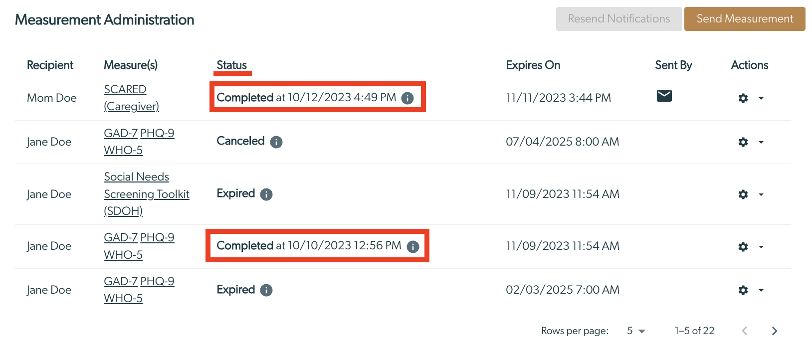 - On the right side, there is a panel titled "Measurement Administration" that lists all of the past and upcoming measurements. The third column records the status of the measure. Within this column, it displays the date and time in which the measure was completed.