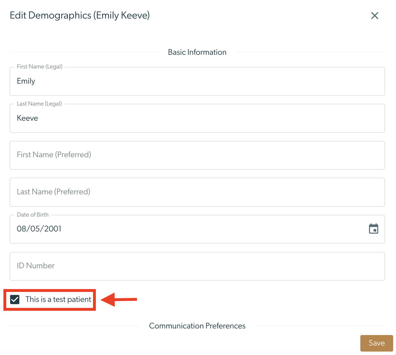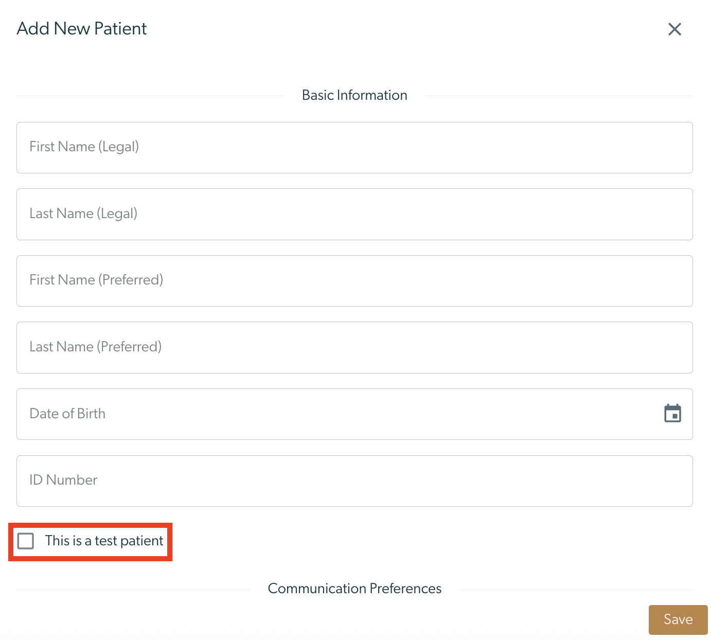 - After inputing the initial information, select the "This is a Test Patient" checkbox.