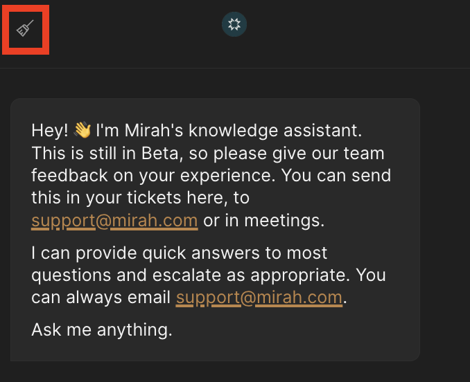 3). Users will now have the ability to input any questions regarding Mirah into the chatbot. Using our knowledge base, the beacon will pull information from our documentation to clearly answer your question. Please type in your question and select "Send."